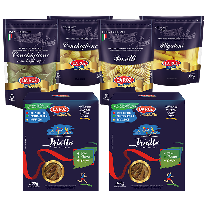 A Linea Fitness Triatlo é o macarrão talharini Da Roz, porcionado em 3 práticas embalagens individuais de 100g cada. Além de ser integral, é apresentado nas versões Whey Protein, Proteína de Soja e Batata Doce, ingredientes ideiais para o esportista que busca melhorar seu desempenho e superar desafios.
